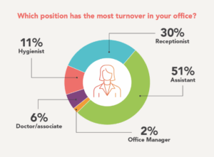 The Office Manager– Normally, this person is one of the longer term positions in your office, as shown in the pie chart, with only 2% of them leaving the job. He or she has been on the front lines, hiring/firing, training, searching again for replacements, training, etc. My guess is that this person is well aware of the reasons the office is having difficulties, but has to keep that confidential. I wish there was a freer exchange of information between the owner-doctor(s) and the Office Manager.